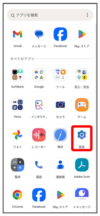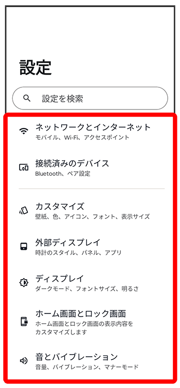 | ネットワークとインターネット | Wi-Fiやモバイルネットワーク、データ使用量など、ネットワークやインターネットに関する設定ができます。 |