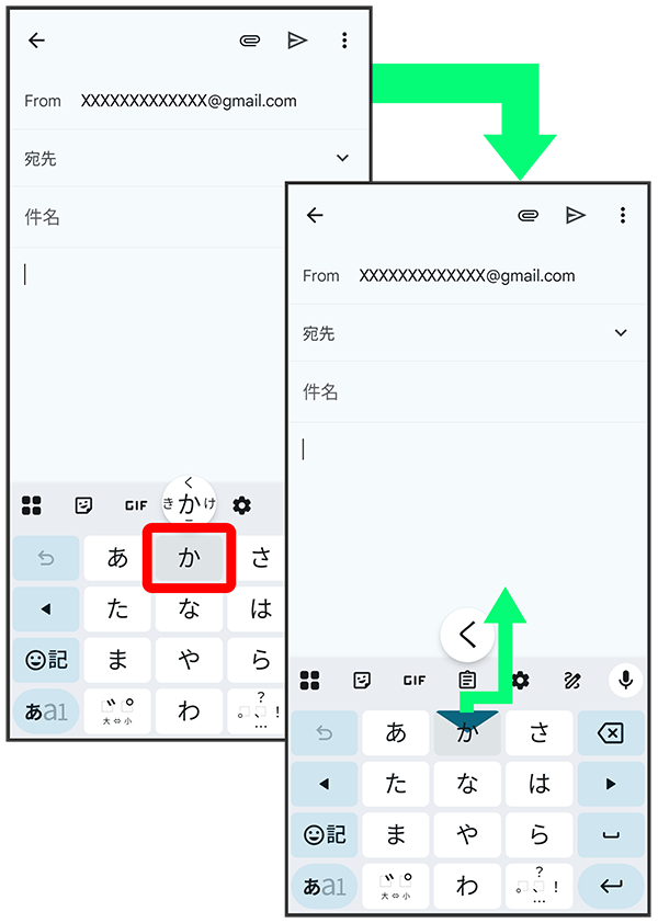 キーを上下左右にフリックすることで、キーを繰り返しタップすることなく、入力したい文字を入力できます。キーに触れると、フリック入力で入力できる候補が表示されます。入力したい文字が表示されている方向にフリックすると、文字が入力されます。
