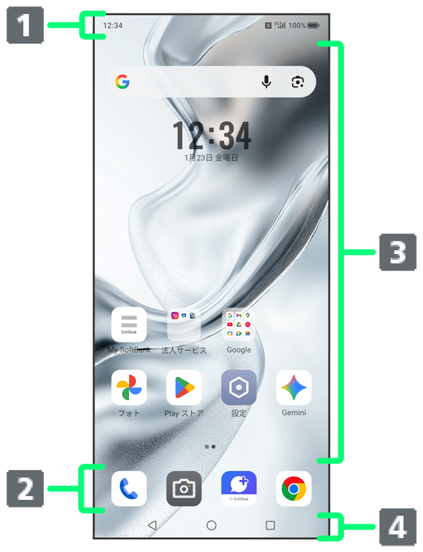 | カスタマイズエリア | アプリのショートカットやフォルダ、ウィジェットを自由に配置できます。 |
