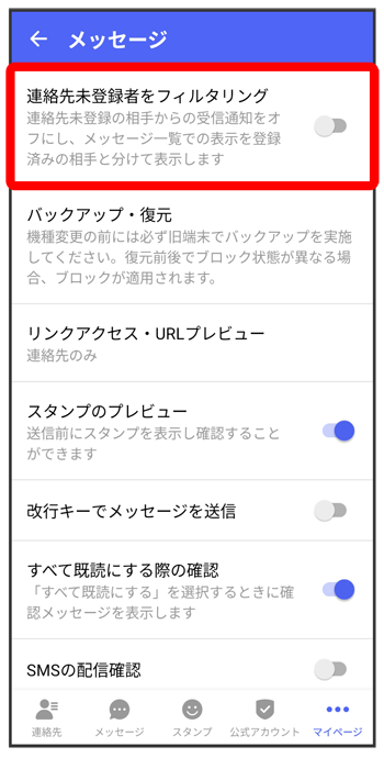 設定を有効にすると、連絡先に登録していない差出人からのメッセージは通知されなくなります。