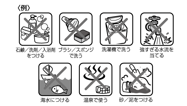 - 万一、塩水や海水、清涼飲料水がかかったり、泥や土などが付着したりした場合には、すぐに洗い流してください。乾燥して固まると、汚れが落ちにくくなり、傷や故障の原因となります。