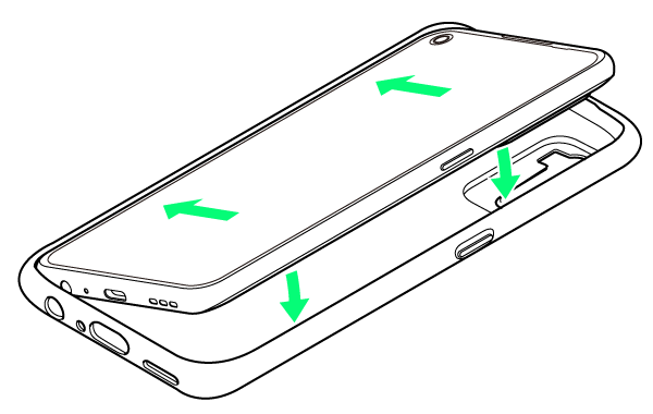 本機と保護ケース(試供品)の角を合わせ、矢印の向きで本機を保護ケース(試供品)にはめ込む
