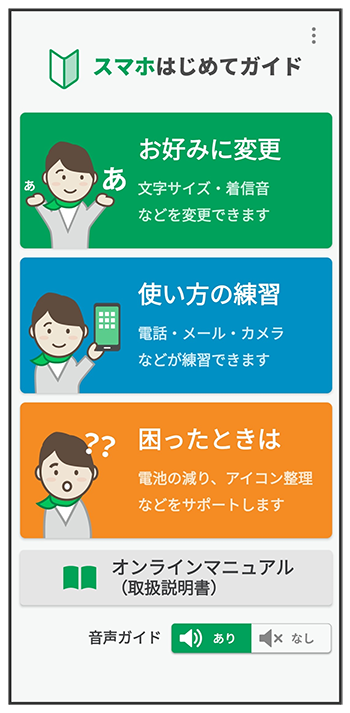 スマホはじめてガイドは、スマホでよく使う機能の練習や、基本的な設定をかんたんに行うことができます。