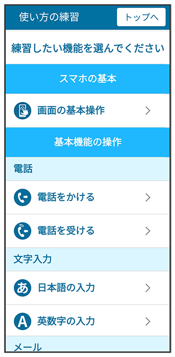 「使い方の練習」では、スマホでよく使う基本的な機能を、実際の画面で練習することができます。