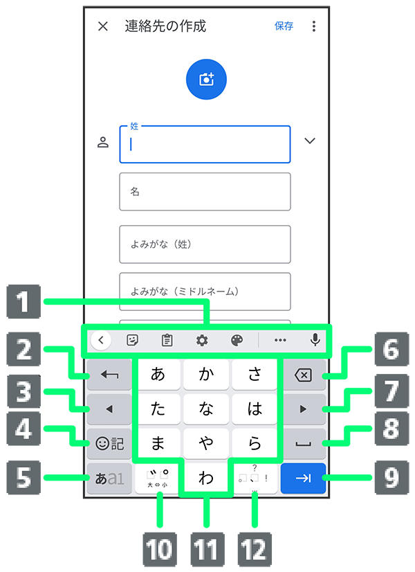 - 文字入力モードを切り替えます(ひらがな/半角英字/数字)。ロングタッチすると入力オプションが表示されます。