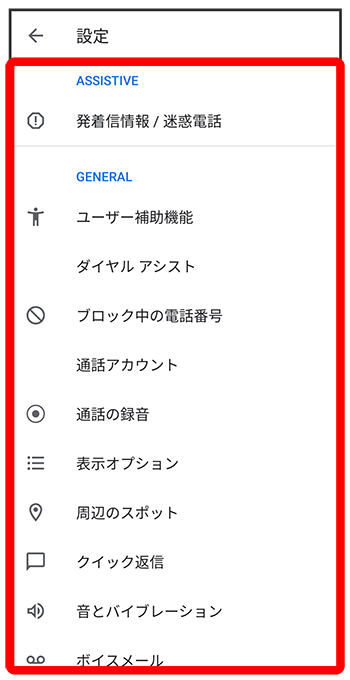 | 発着信情報/迷惑電話 | ・発信者番号とスパムの番号を表示 連絡先にない電話番号の発信者名や、迷惑電話の可能性がある着信の際に情報が表示される設定をします。 ・迷惑電話をブロック 迷惑電話の疑いがある通話をブロックします。 |