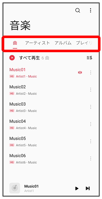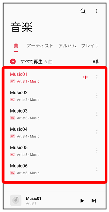 - /をタップすると、アーティスト/アルバム名が一覧で表示されます。アーティスト/アルバム名をタップしてから、曲名をタップすると曲が再生されます。