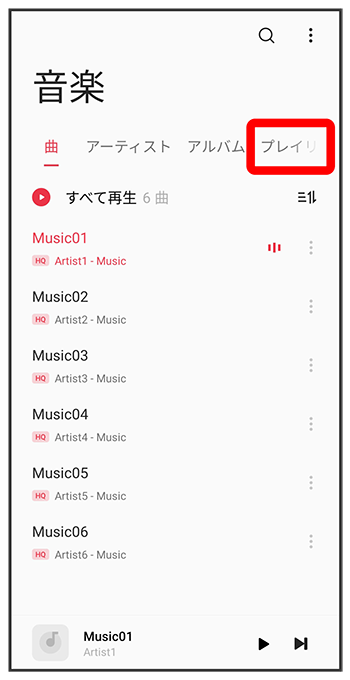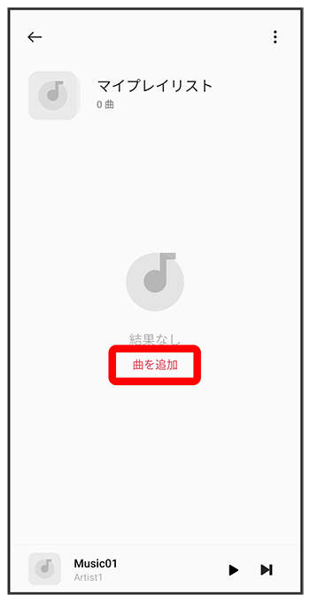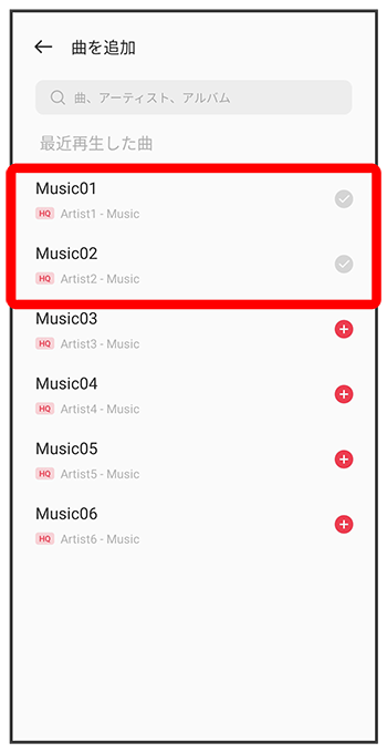 - 曲名が表示されない場合は、検索バーをタップ曲名/アーティスト名/アルバム名を入力