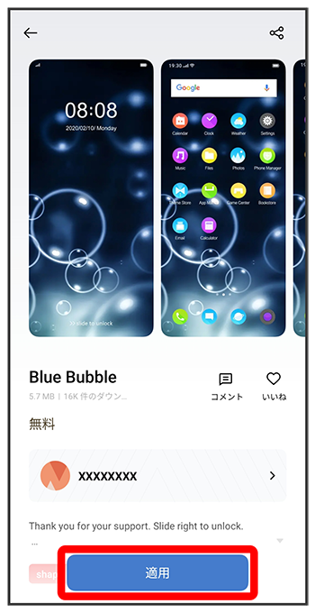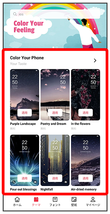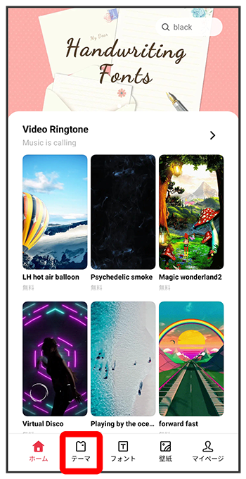 テーマストア画面で設定するフォントを選択壁紙を設定する