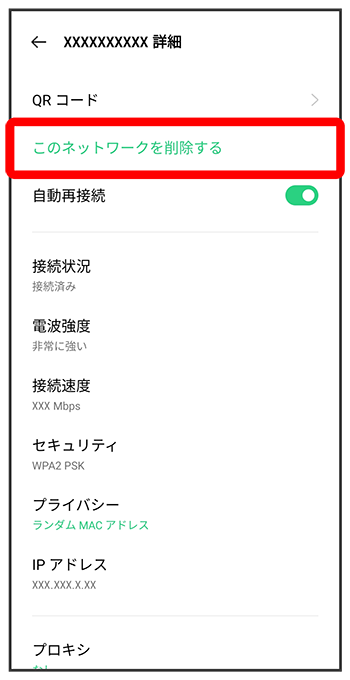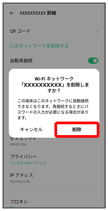 - Wi-Fiネットワークを削除すると、再接続のときにパスワードの入力が必要になる場合があります。