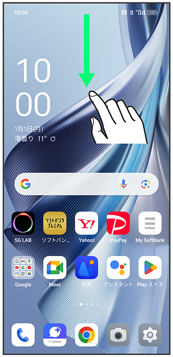 ステータスバーを下にフリック/スワイプ