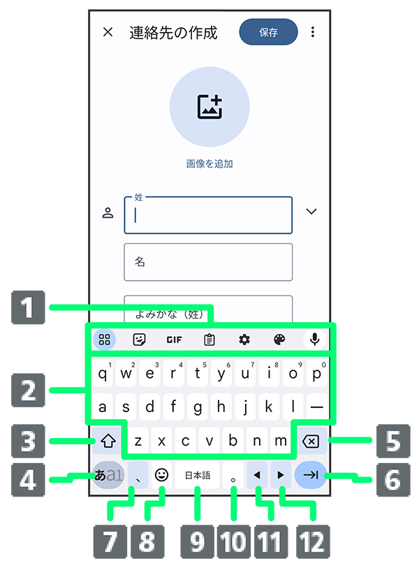 - 入力文字モードを切り替えます(ひらがな/半角英字/数字)。ロングタッチすると入力オプションが表示されます。