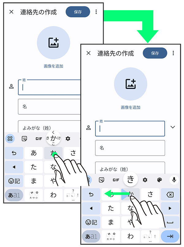 12キーで入力するとき、キーを上下左右にフリックすることで、キーを繰り返しタップすることなく、入力したい文字を入力できます。キーに触れると、フリック入力で入力できる候補が表示されます。入力したい文字が表示されている方向にフリックすると、文字が入力されます。