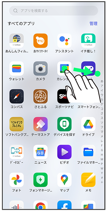 追加したいアプリをロングタッチし、そのままドラッグ
