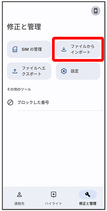 内部ストレージに保存(バックアップ)した連絡先データを読み込み(インポート)できます。