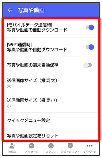 | [モバイルデータ通信時]写真や動画の自動ダウンロード | モバイルデータ通信時に受信した写真や動画を自動でダウンロードするかどうかを設定します。 |