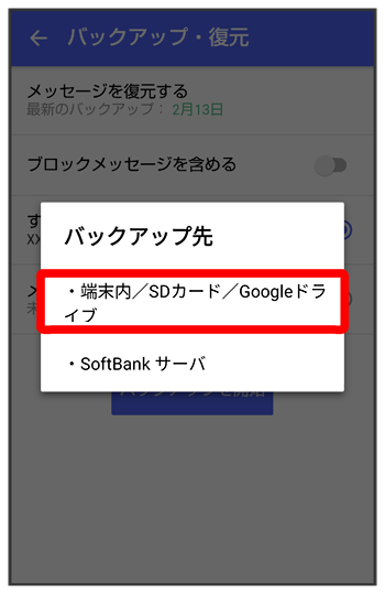 メッセージデータを内部ストレージ/Google ドライブにバックアップする