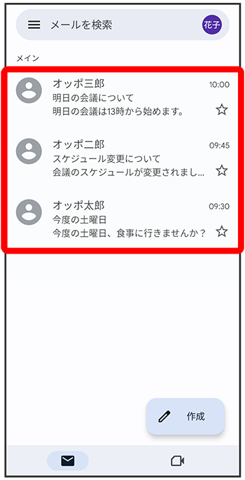 メール一覧画面で未読にするメールをロングタッチメールを削除する