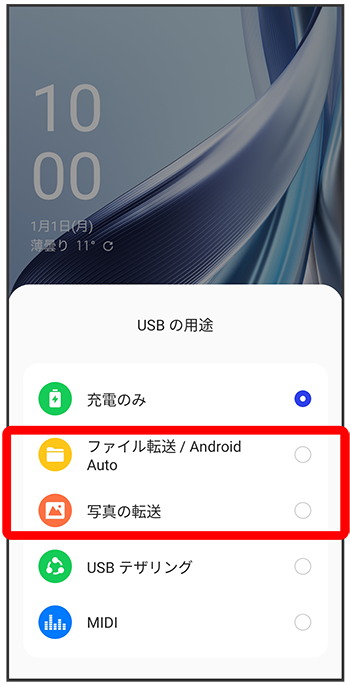 | ファイル転送/Android Auto | 本機に保存されている各種ファイル(写真、動画、音楽)を、パソコンとやりとりできます。 |
