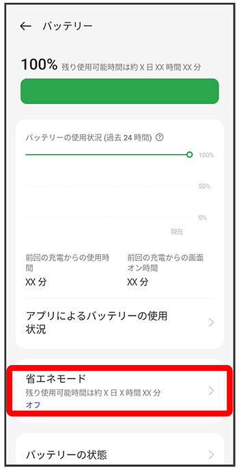 省エネモード設定画面で(- をタップするたびに、有効(