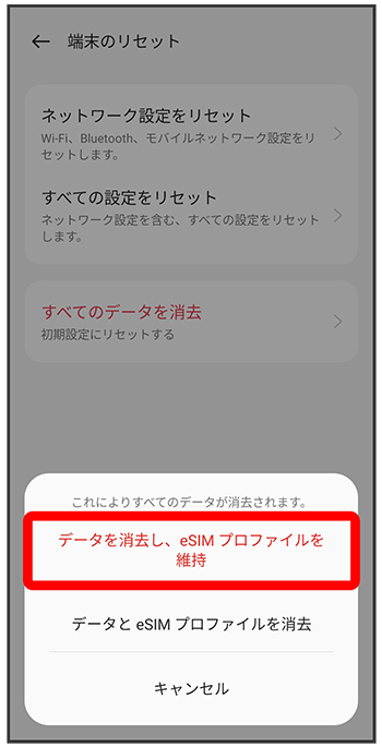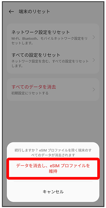 - を選択すると、現在利用しているeSIMが消去されますのでご注意ください。