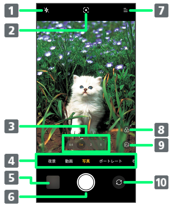 ロングタッチして目盛を左右にドラッグしても、ズーム倍率を切り替えられます。 - 撮影モード切り替え