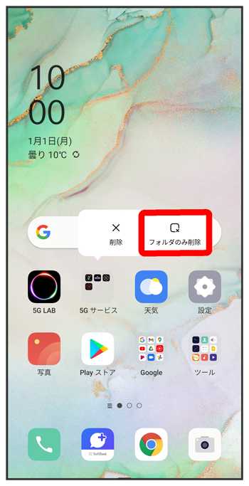(削除)をタップすると、中身のアイコンごとフォルダをホーム画面から削除します。