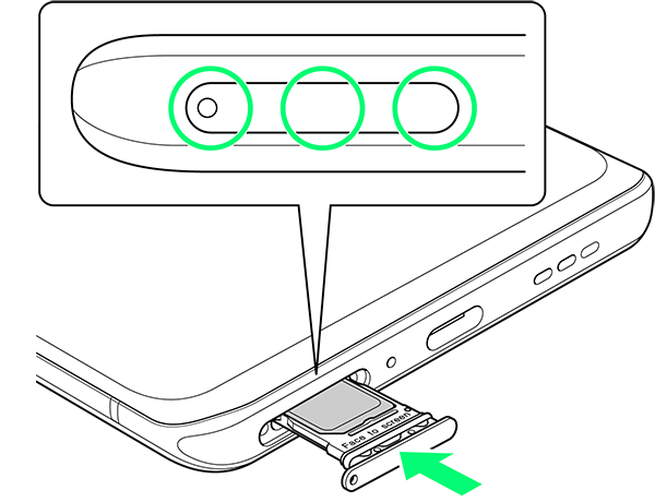 - ○部分をしっかりと押し、本体とSIMカードトレイにすき間がないことを確認してください。