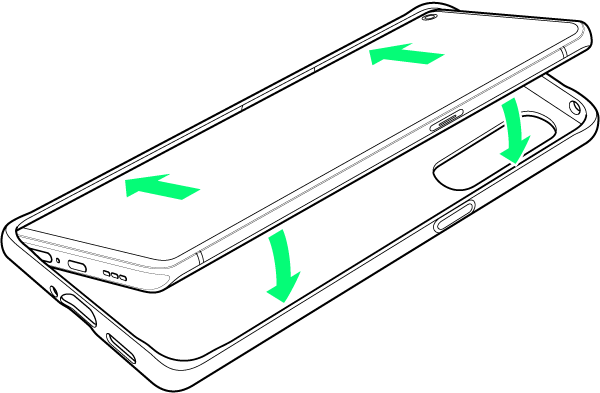 本機と保護ケース(試供品)の角を合わせ、矢印の向きで本機を保護ケース(試供品)にはめ込む