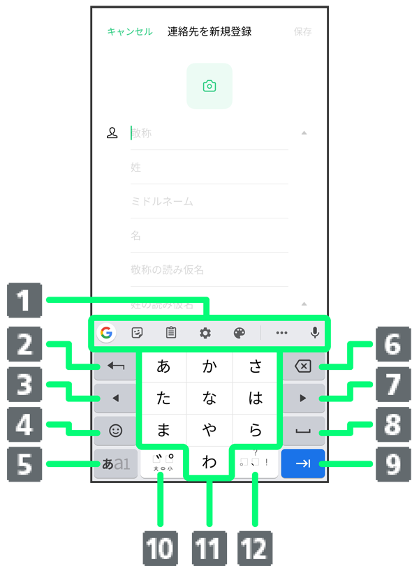 - 文字入力モードを切り替えます(ひらがな/半角英字/数字)。ロングタッチすると入力オプションが表示されます。
