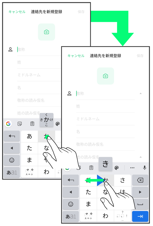 12キーで入力するとき、キーを上下左右にフリックすることで、キーを繰り返しタップすることなく、入力したい文字を入力できます。キーに触れると、フリック入力で入力できる候補が表示されます。入力したい文字が表示されている方向にフリックすると、文字が入力されます。