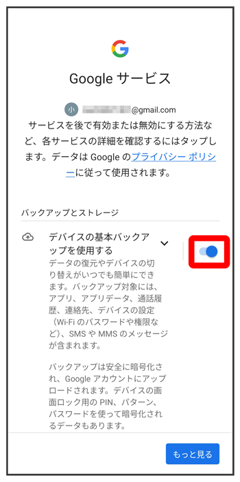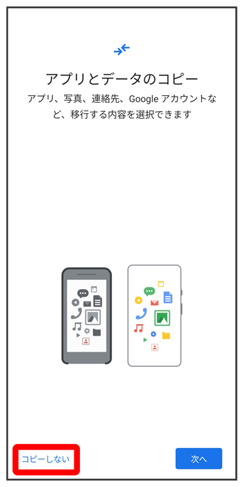 - をタップすると、Google アカウントを設定しているほかの端末からデータをコピーできます。画面の指示に従って操作してください。