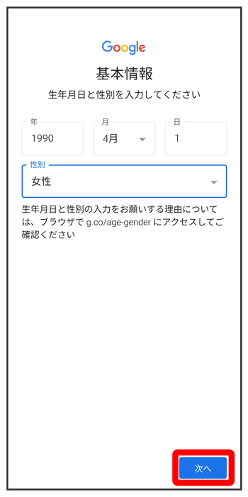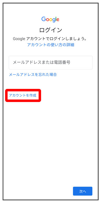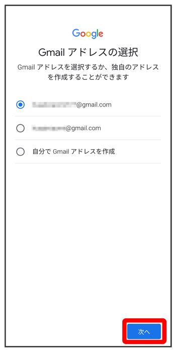 - 自分でGmail アドレスを作成する場合は、ユーザー名(メールアドレス)を入力と操作します。