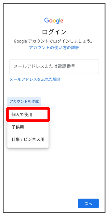 - 子供用/ビジネスの管理用のアカウントを作成する場合は、/をタップして画面の指示に従って操作してください。