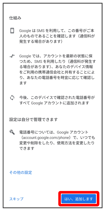 - セキュリティ保護目的でのみ電話番号を追加するときは、をタップします。以降は画面の指示に従って操作してください。