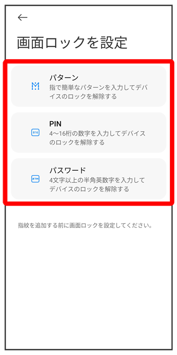- 指紋認証ができないときの予備の画面ロック解除方法になります。