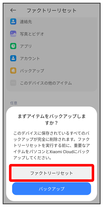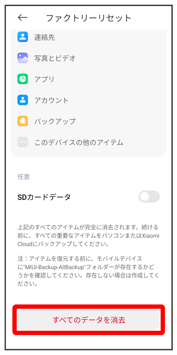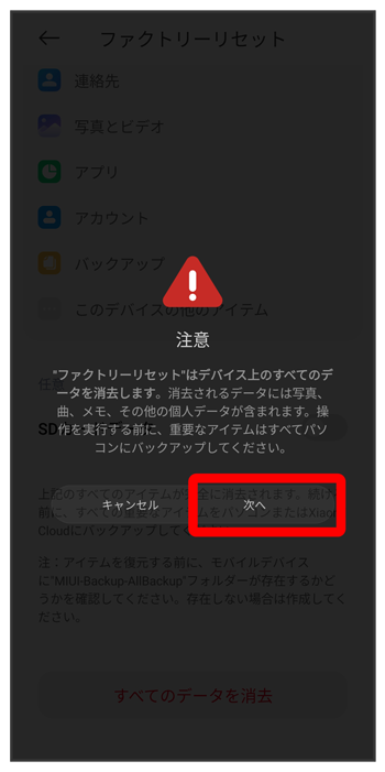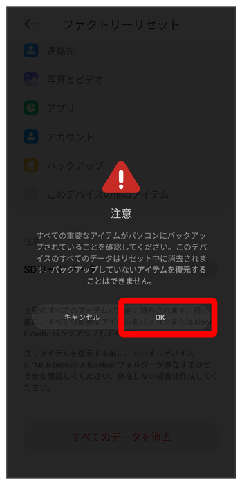 eSIMデータの消去についての画面が表示されます。を選択すると、現在利用しているeSIMが消去されますのでご注意ください。