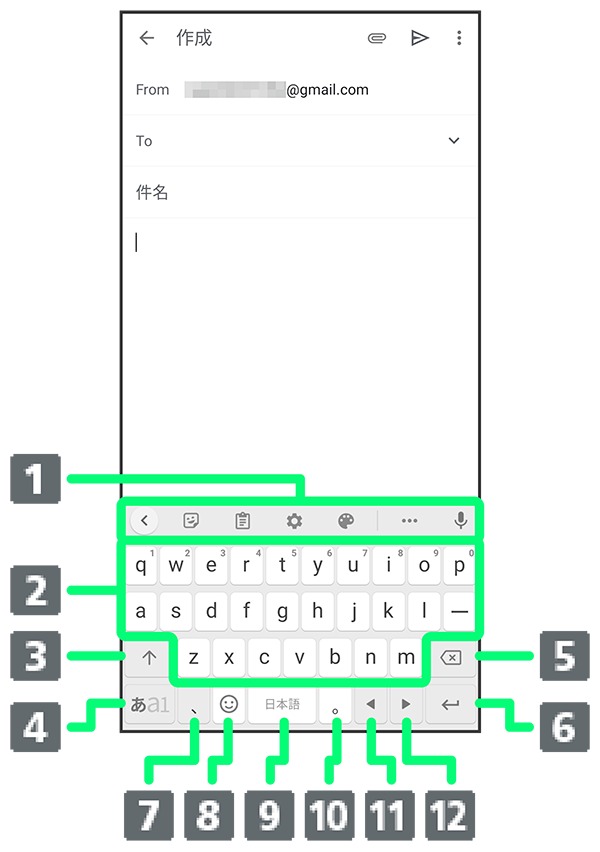 - 文字入力モードを切り替えます(ひらがな/半角英字/数字)。ロングタッチすると入力オプションが表示されます。