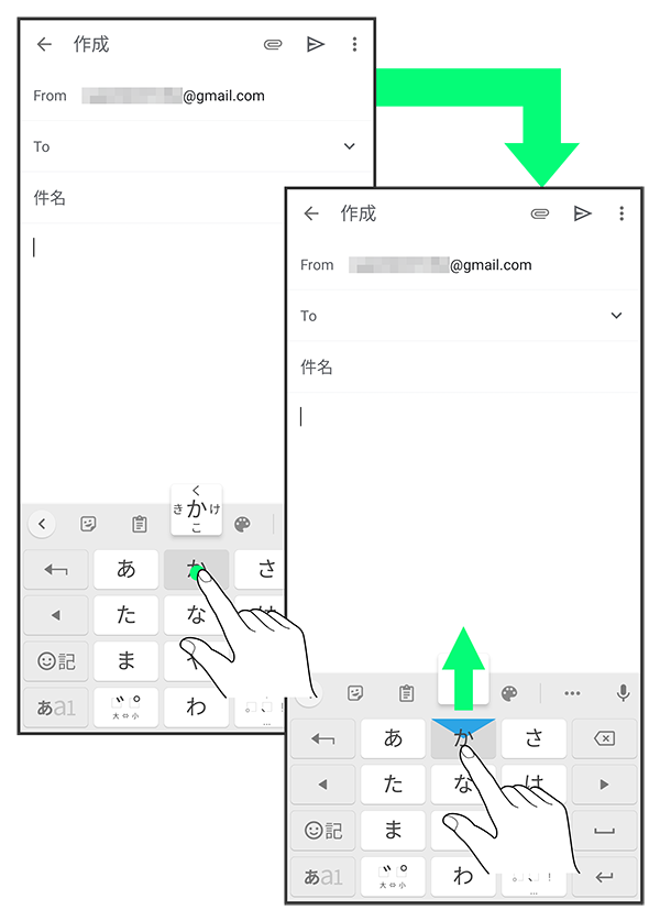 12キーで入力するとき、キーを上下左右にフリックすることで、キーを繰り返しタップすることなく、入力したい文字を入力できます。キーに触れると、フリック入力で入力できる候補が表示されます。入力したい文字が表示されている方向にフリックすると、文字が入力されます。