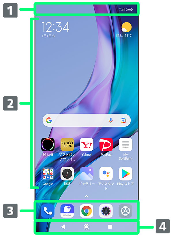| カスタマイズエリア | アプリのショートカットやフォルダ、ウィジェットを自由に配置できます。 |