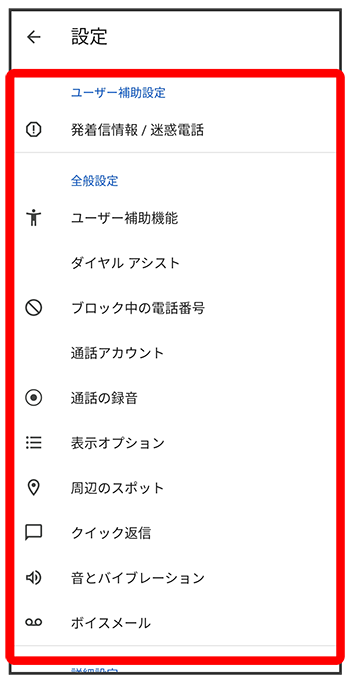 | 発着信情報 / 迷惑電話 | ・発信者番号とスパムの番号を表示 連絡先にない電話番号の発信者名を表示するかどうかを設定します。 ・迷惑電話をブロック 迷惑電話の可能性がある着信の情報を表示させるかどうかを設定します。 |