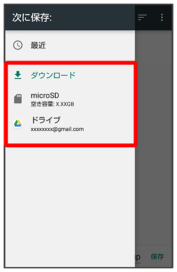 - SDカードはSDカードを挿入している場合、Google ドライブはGoogle アカウントを設定している場合に表示されます。