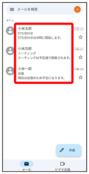 メール一覧画面で未読にするメールをロングタッチ(メールを削除する