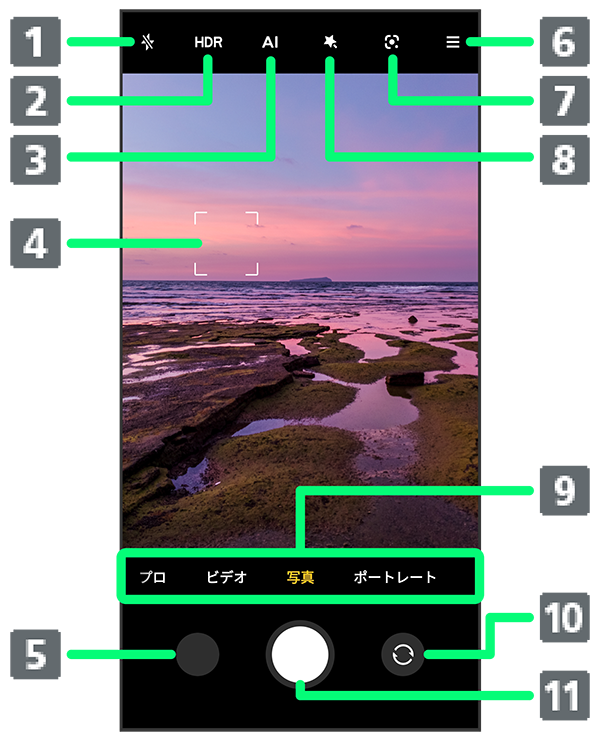 左右にドラッグしても撮影モードを切り替えられます。 - カメラの切り替え