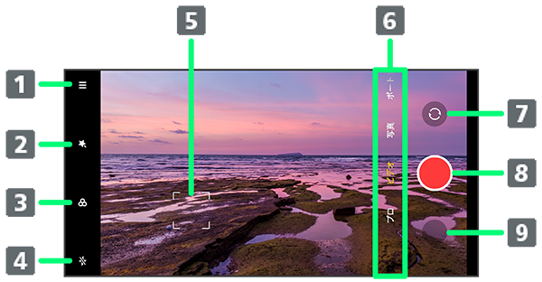 リアカメラ/フロントカメラを切り替えます。 - 動画撮影を開始/停止