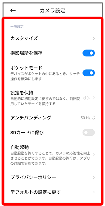| デフォルトの設定に戻す | カメラの設定を初期化します。 |