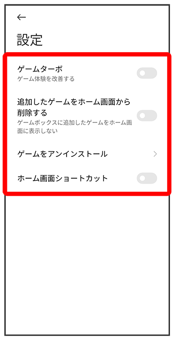 | ホーム画面ショートカット | ゲームターボ画面のショートカットをホーム画面に追加するかどうかを設定します。 |