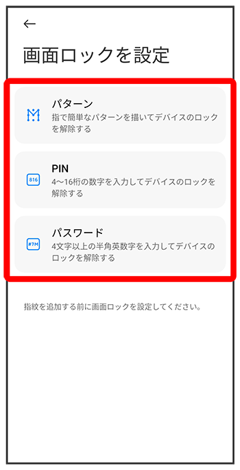 画面の指示に従って画面ロック解除用のパターン/PIN/パスワードを設定