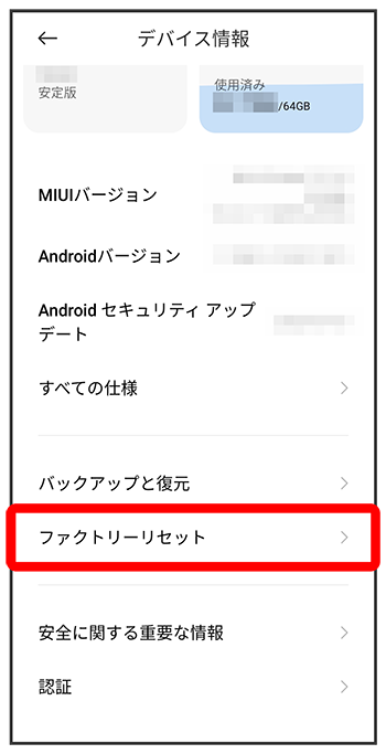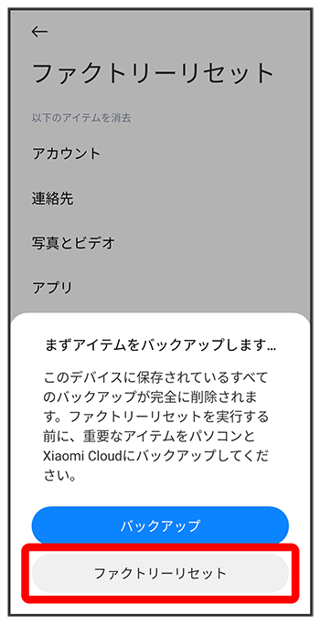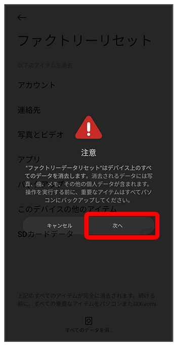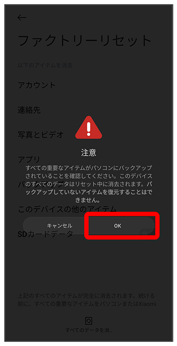 - eSIMを利用している場合は、eSIMデータの消去についての画面が表示されます。を選択すると、現在利用しているeSIMが消去されますのでご注意ください。