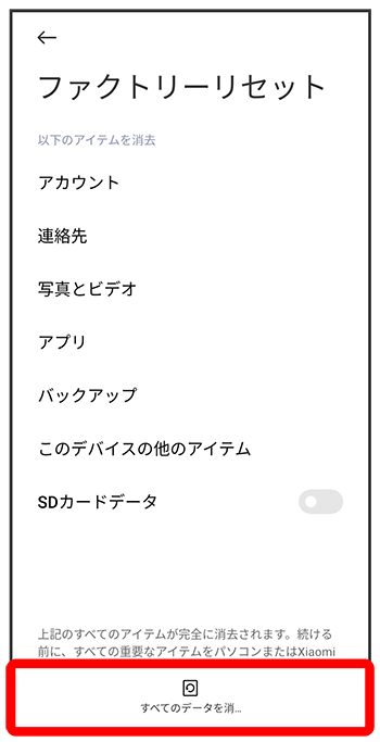 - 取り付けているSDカード内のデータも消去するときは、をタップします(